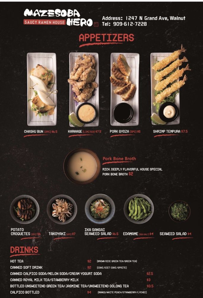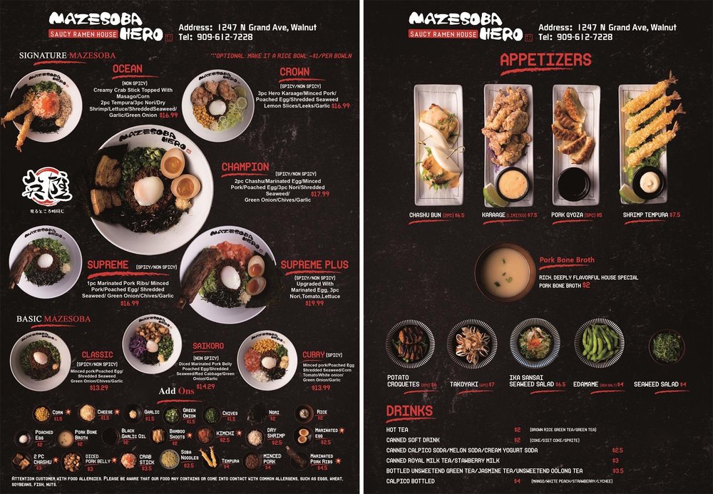 Introducing Mazesoba Hero: Located in Walnut, CA, Mazesoba Hero is a vibrant destination for Asian fusion ramen lovers. This trendy eatery specializes in Mazesoba, a dry-style noodle dish beloved for its unique flavor and texture. The menu offers a variety of delicious options, from the classic Mazesoba to the spicy Tantan and curry variations, all highlighted by perfectly poached eggs and fresh ingredients. Customers rave about the quick service and generous portions, with complimentary rice often served to soak up the rich sauces.